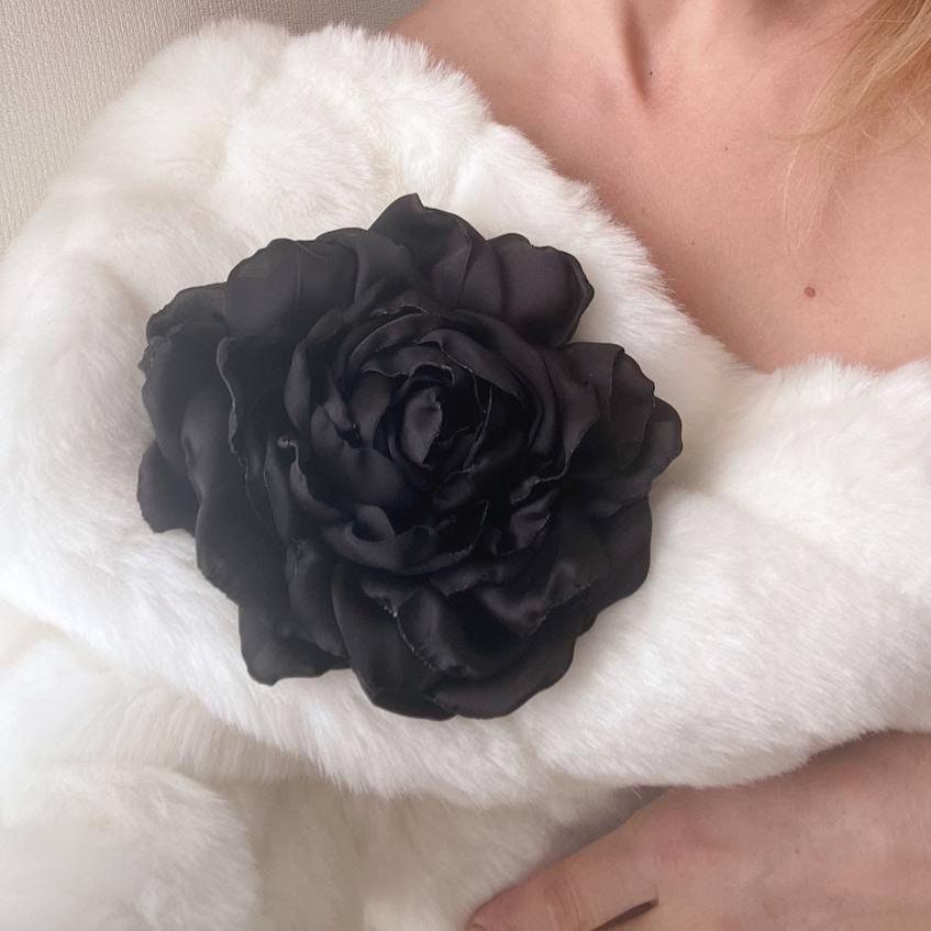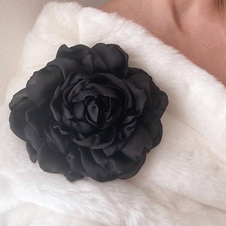 A bold and elegant black Camellia Rose brooch (10–11 cm) – perfect for gothic weddings, evening parties, or Halloween fashion.
