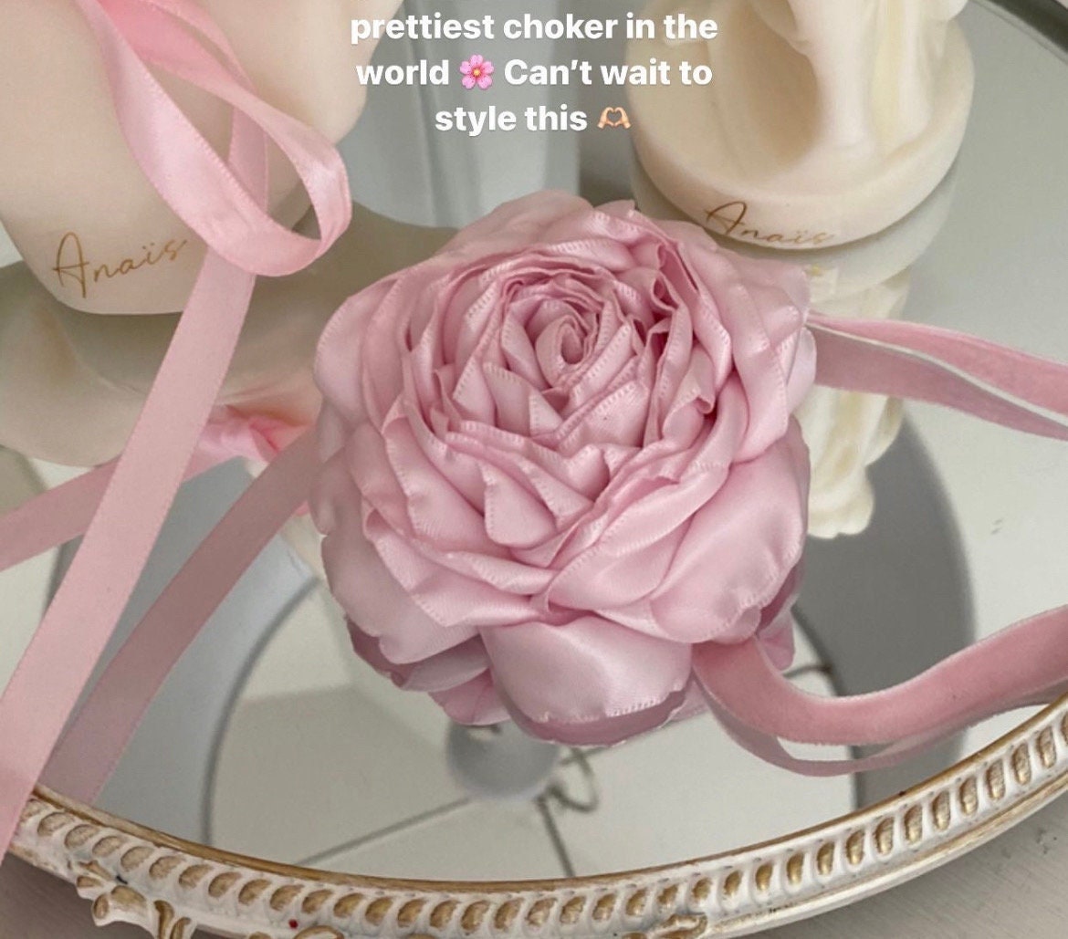 Handmade Satin Silk Flower Rose Choker: Pink Floral Necklace with Adjustable Ribbon Tie