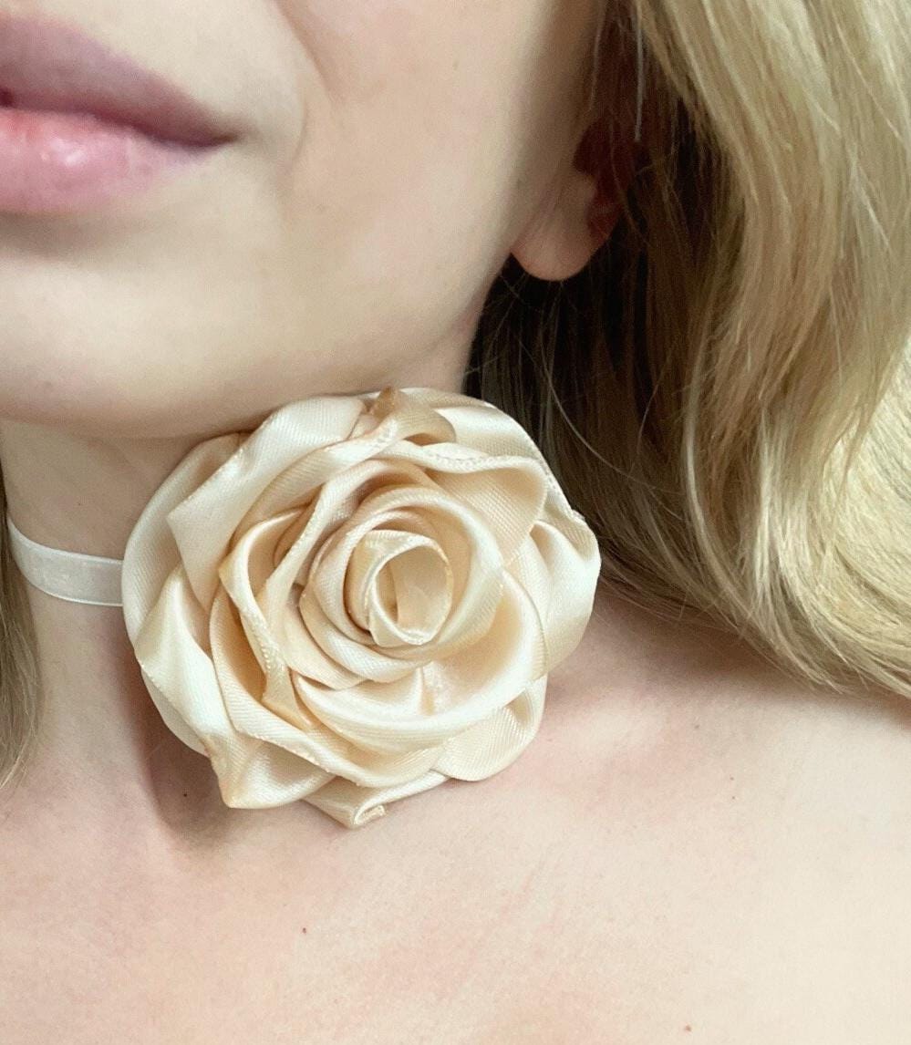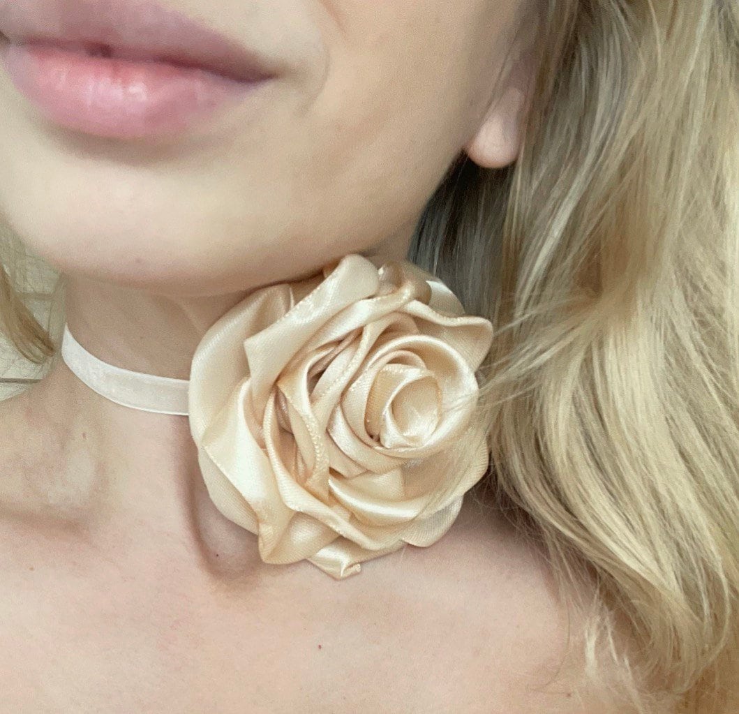 Champagne Satin Rose Choker - Bride & Bridal Party Jewelry - Elegant Wedding Necklace Bridesmaids and Guests