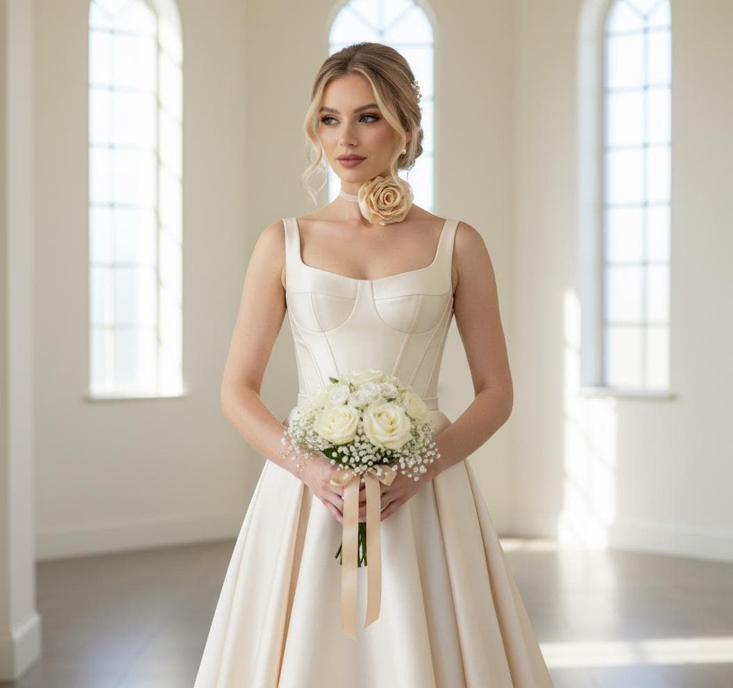 Celebrate your big day in timeless elegance — this champagne satin rose choker is designed for the bride and her bridal party, adding a soft, romantic glow to every wedding look.