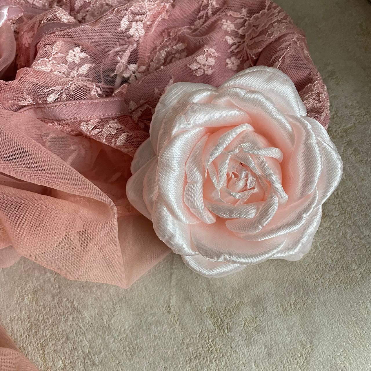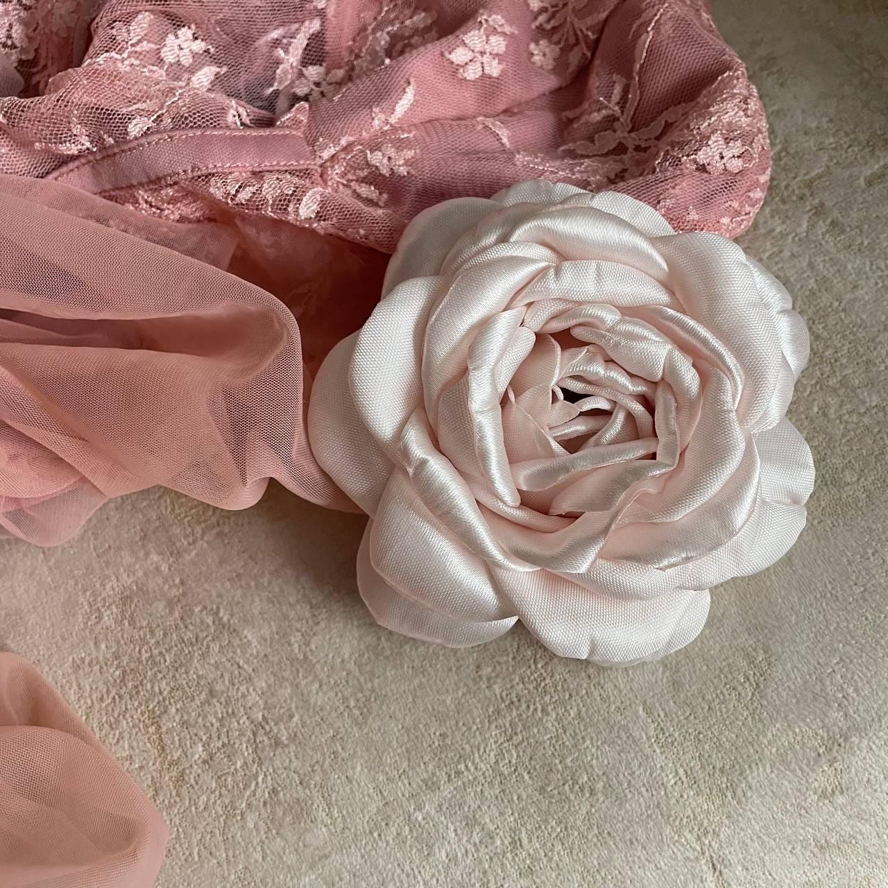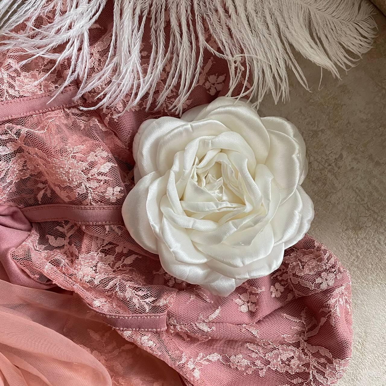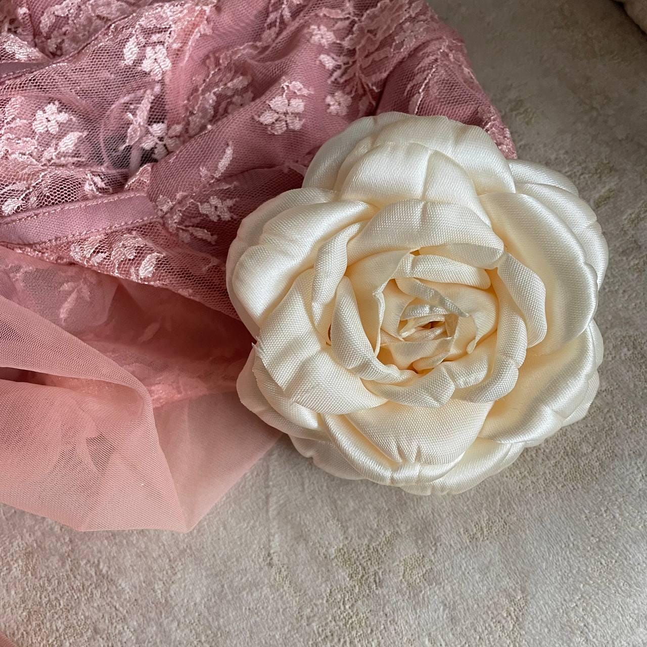 Handmade wedding flower brooch in the style of a satin silk Camellia Rose pin (10–11 cm). This elegant bridal accessory is a timeless keepsake gift for the Bride, Mother of the Bride, or bridal party.