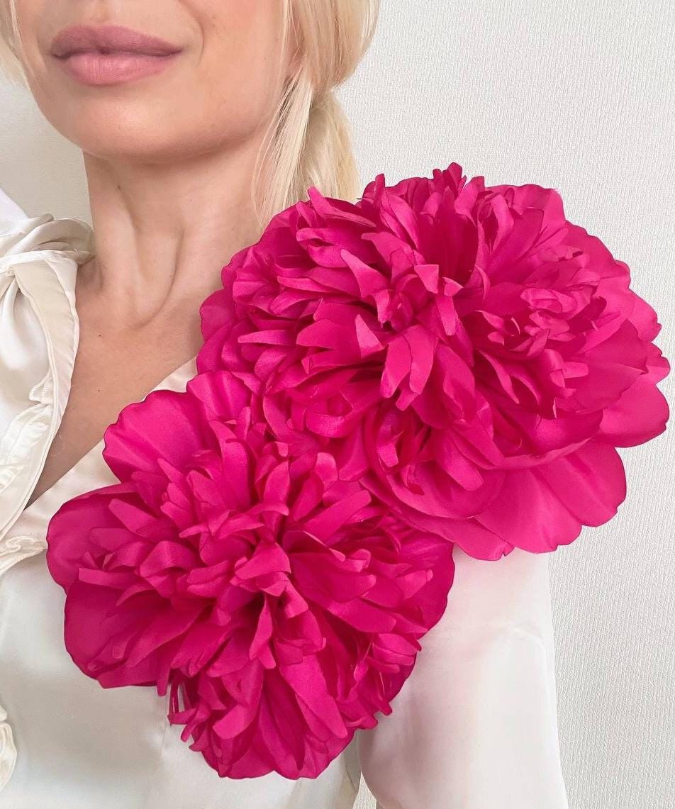 Handmade Oversized Fuchsia Peony Brooch - Satin Taffeta Flower Pin - Floral Corsage for Wedding Guest