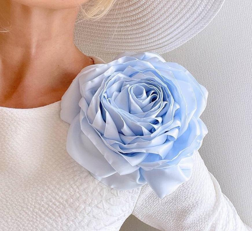 Handmade pale blue flower brooch 🌸 oversized satin silk rose pin — elegant wedding corsage. Custom color available for bride, mom, or bridesmaids.
