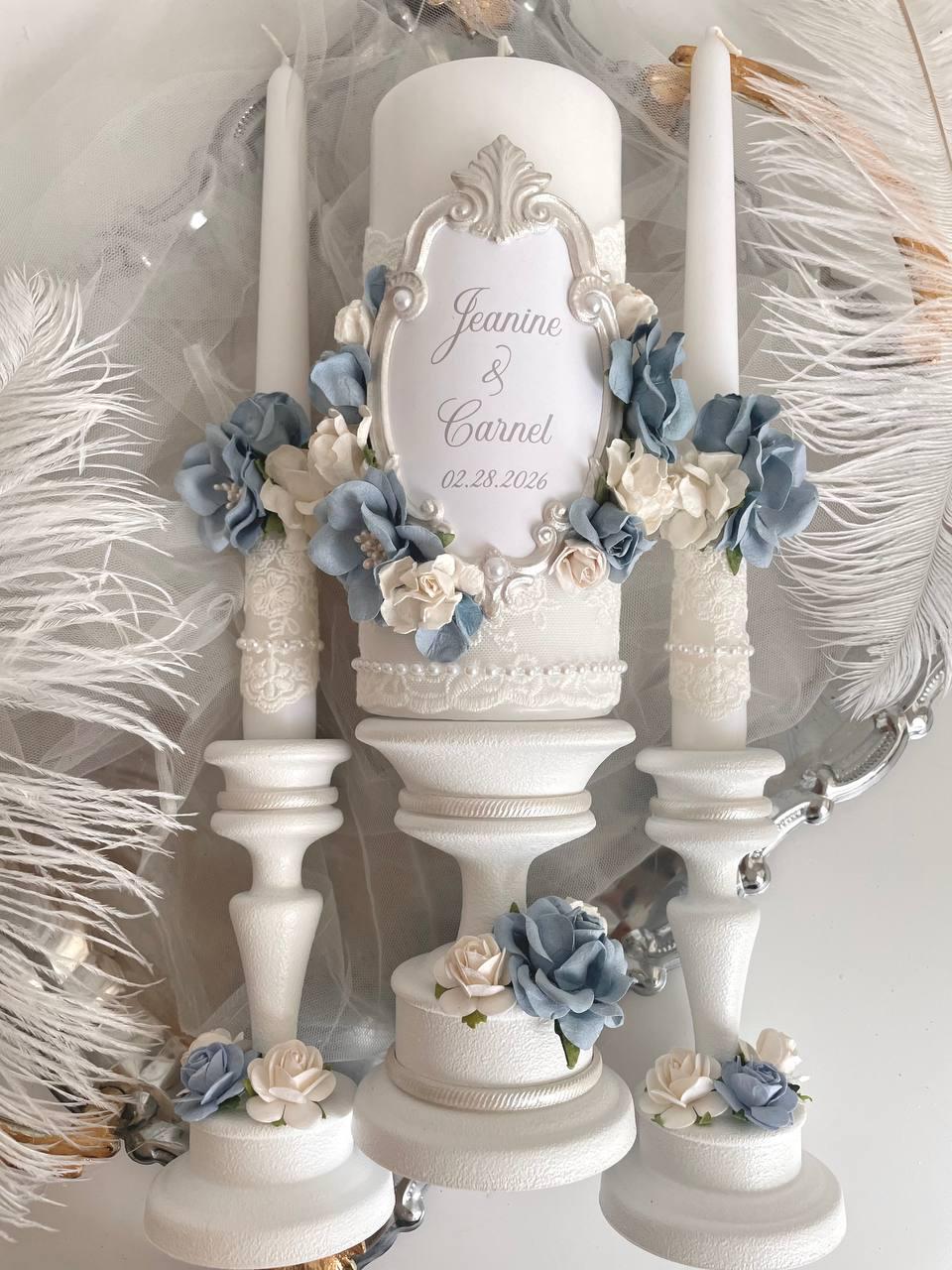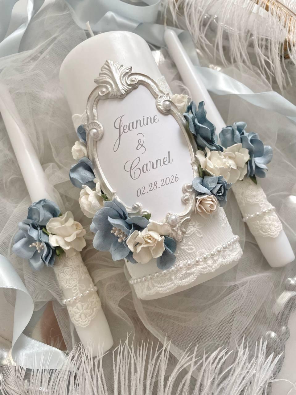 Wedding unity candle with dusty blue flowers, off-white or ivory lace, pearly silver frame, pearl accents, and personalized names, date, Bible verse or cross.