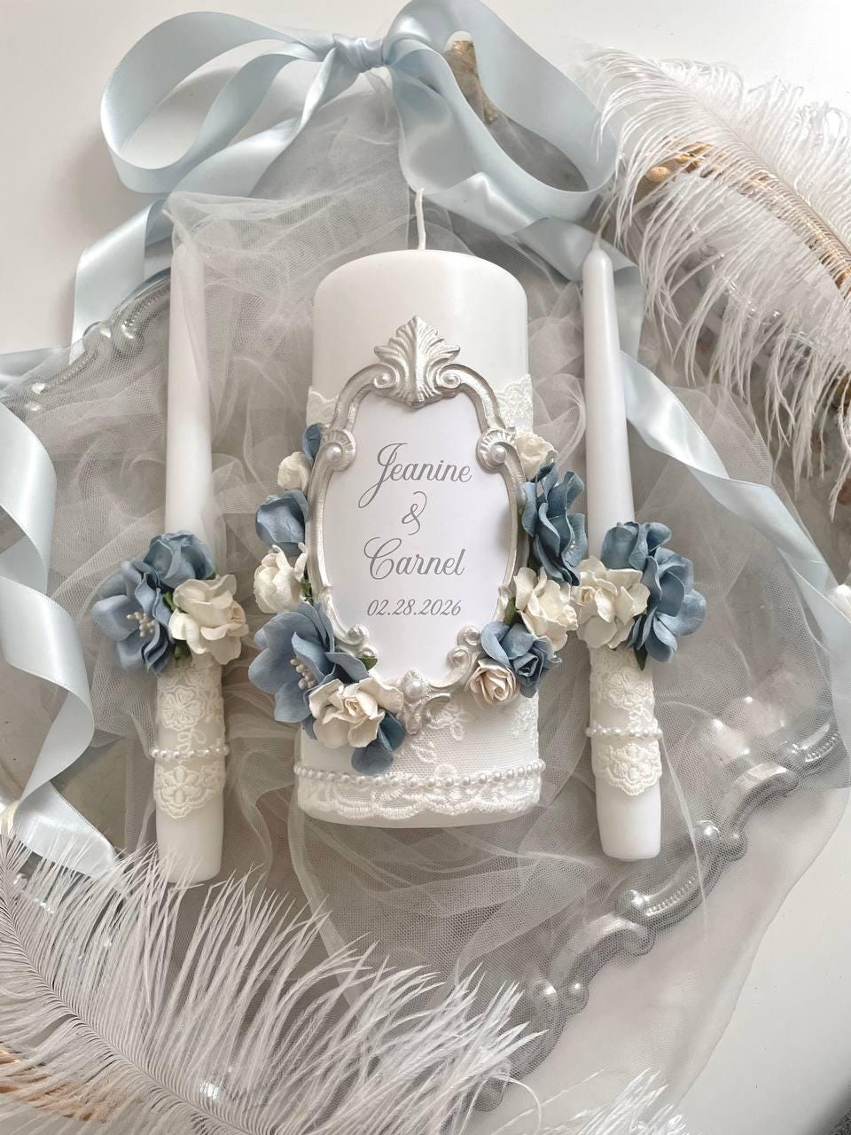 Make your ceremony unforgettable with this elegant Wedding Unity Candle, handcrafted with soft dusty-blue flowers, delicate lace, and a pearly silver frame.