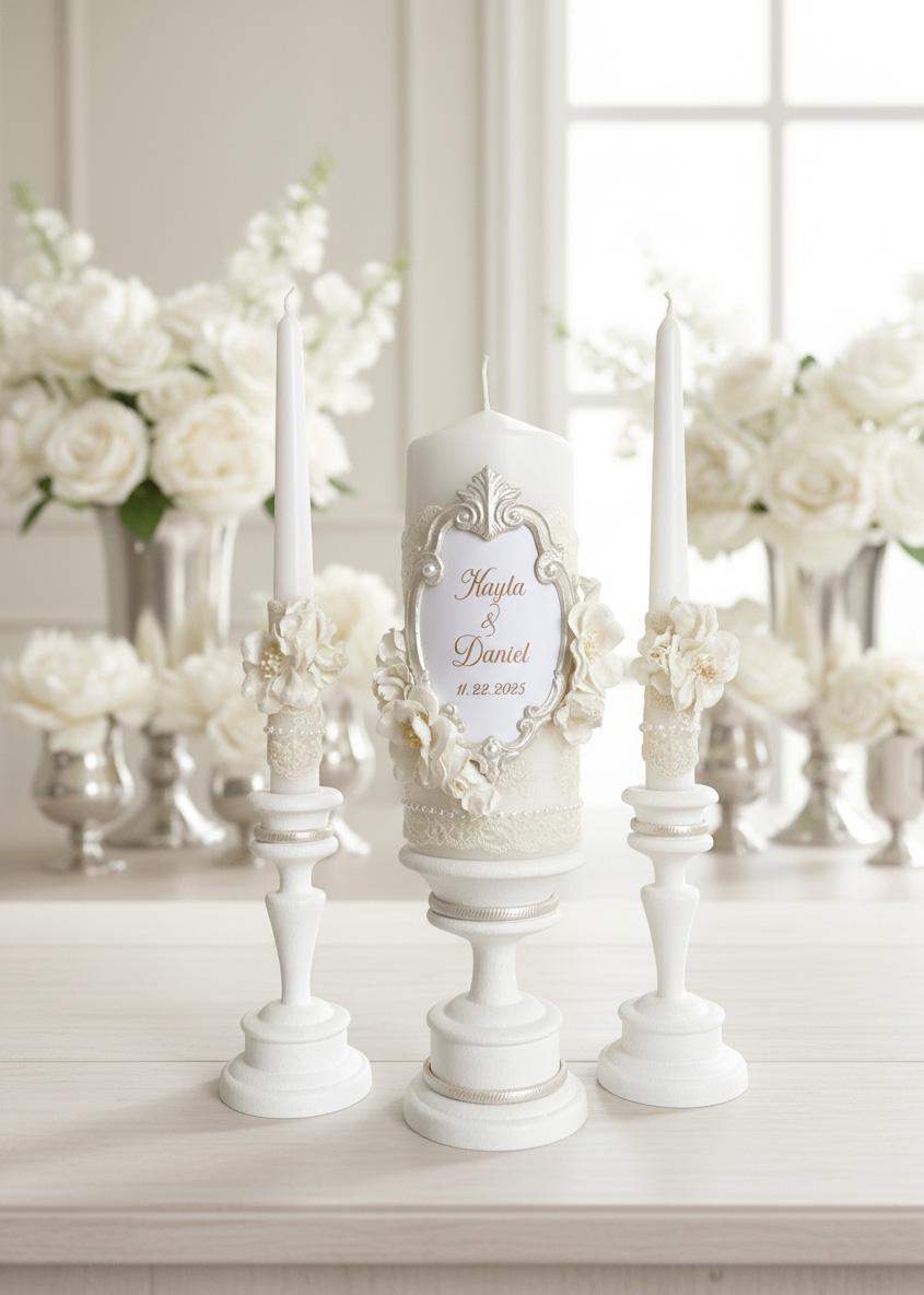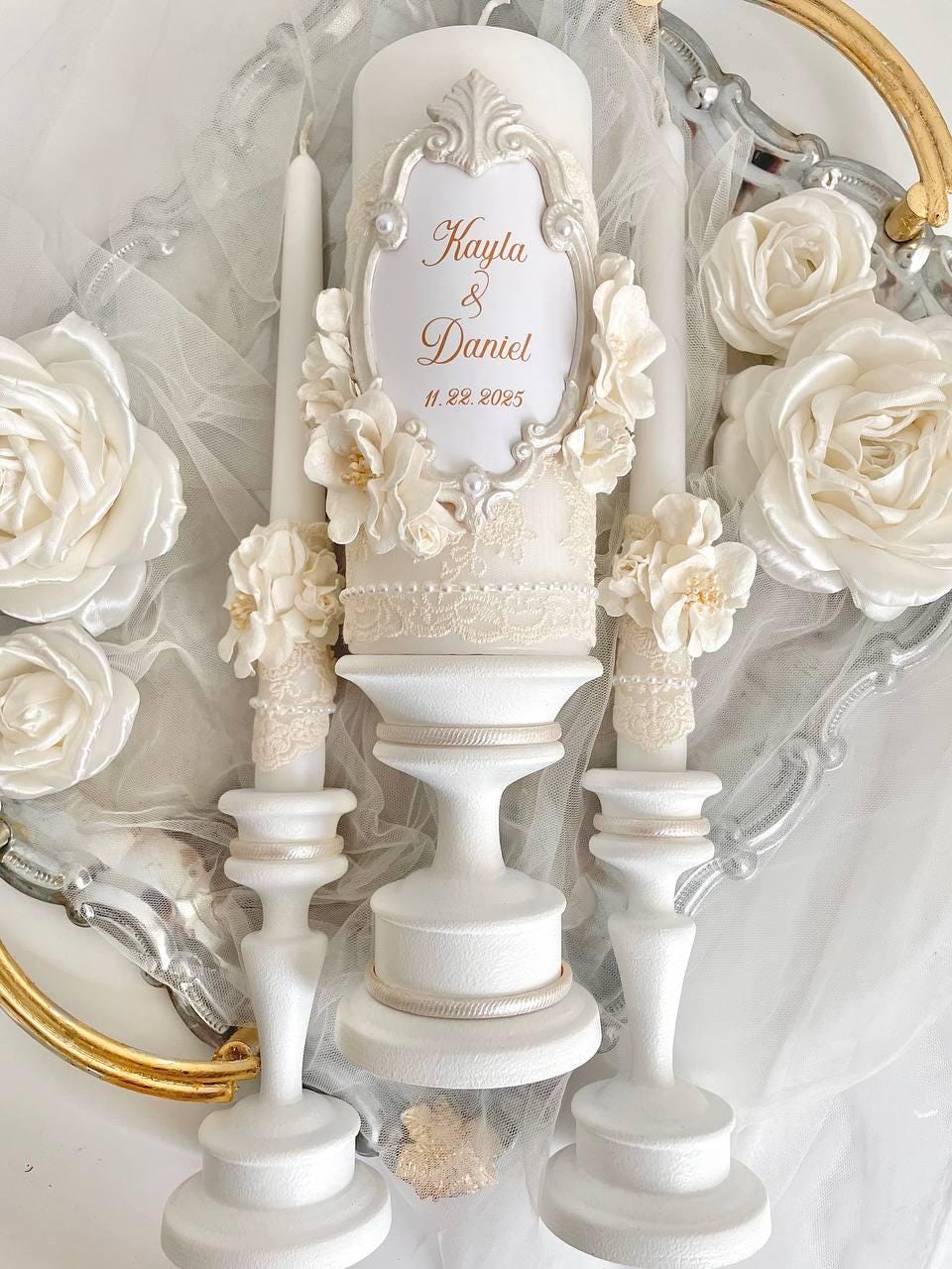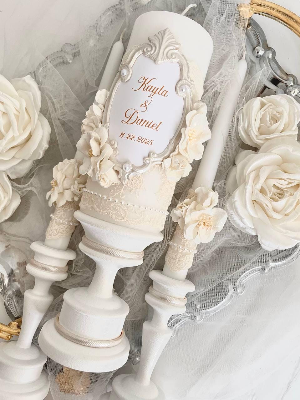 Each candle is decorated with elegant lace, soft off-white or ivory florals with golden centers, and a pearly frame personalized with your names, wedding date, or a meaningful church symbol.
