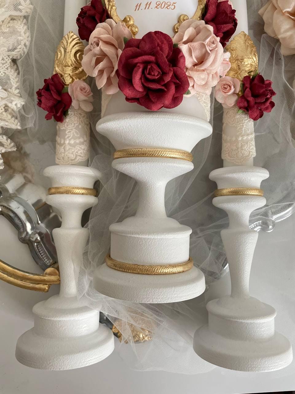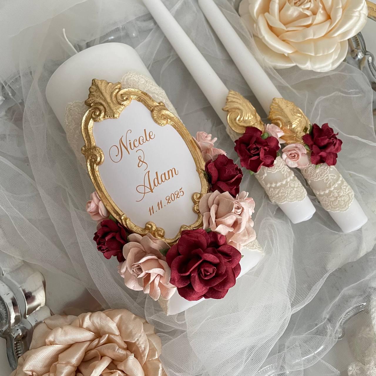 Handmade Burgundy Wedding Unity Candle Set: Custom Color of Flowers, Lace & Gold Details