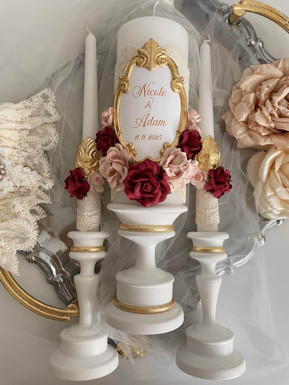 This burgundy and blush lace candle set combines deep passion with timeless tenderness — perfect for fall, vintage, or classic wedding themes.