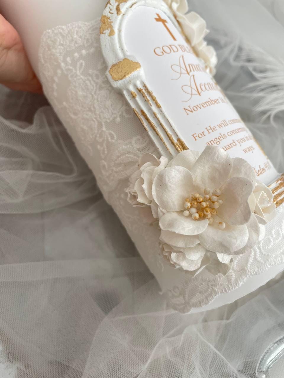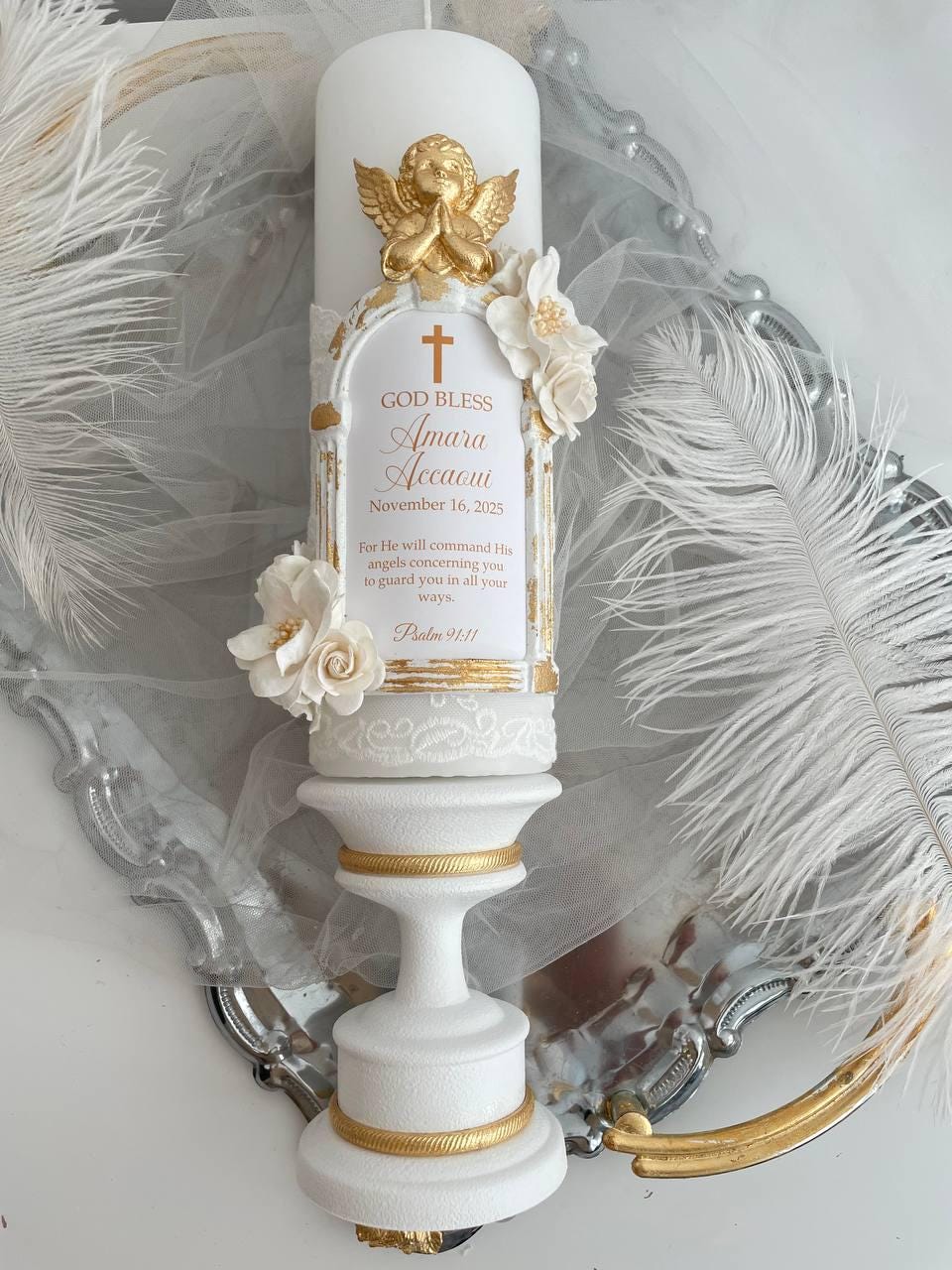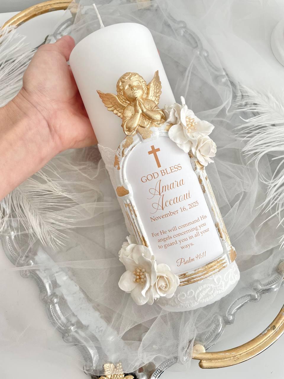 Elegant Baptism Candle with Gold Angel & Lace – personalized keepsake for Baptism, First Holy Communion or Dedication. Handmade heirloom decor.
