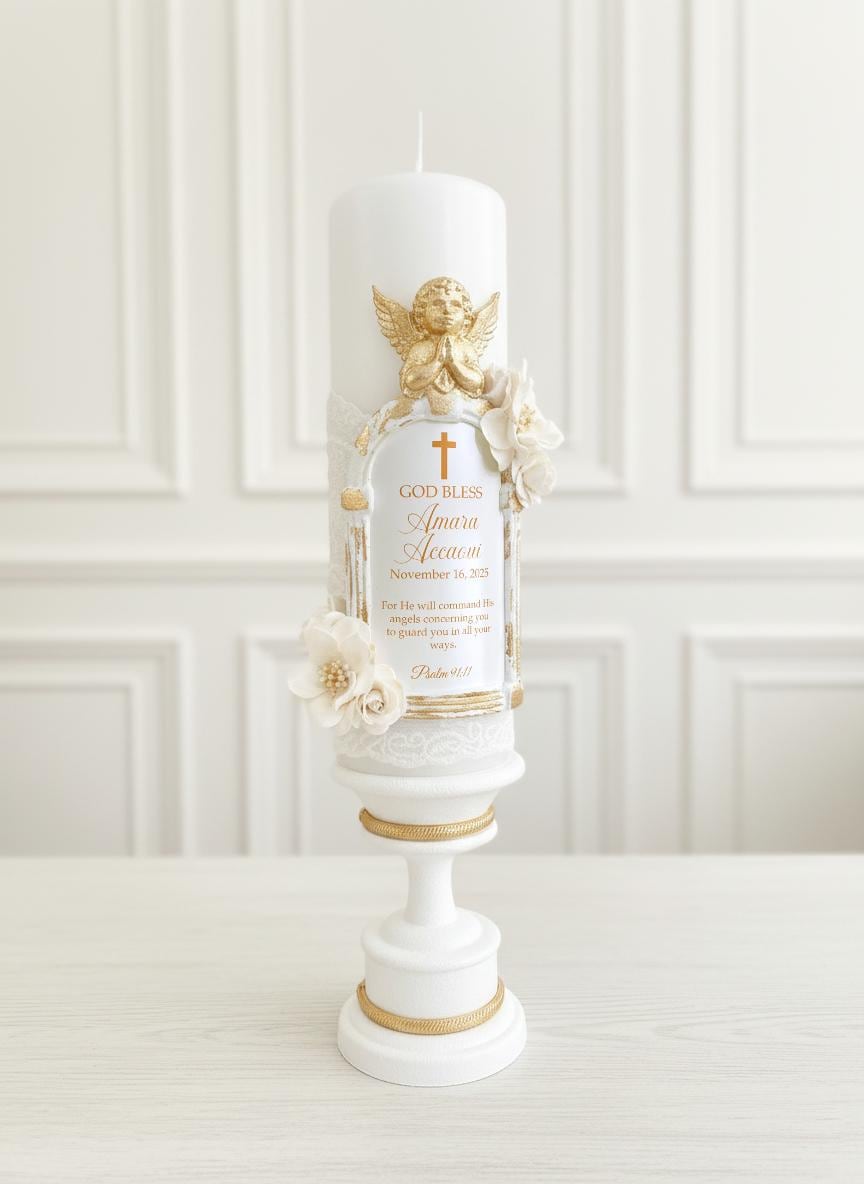 Candle features a hand-gilded angel, personalized name, date, and cross, making it perfect for Baptism, First Holy Communion, or Dedication ceremonies.