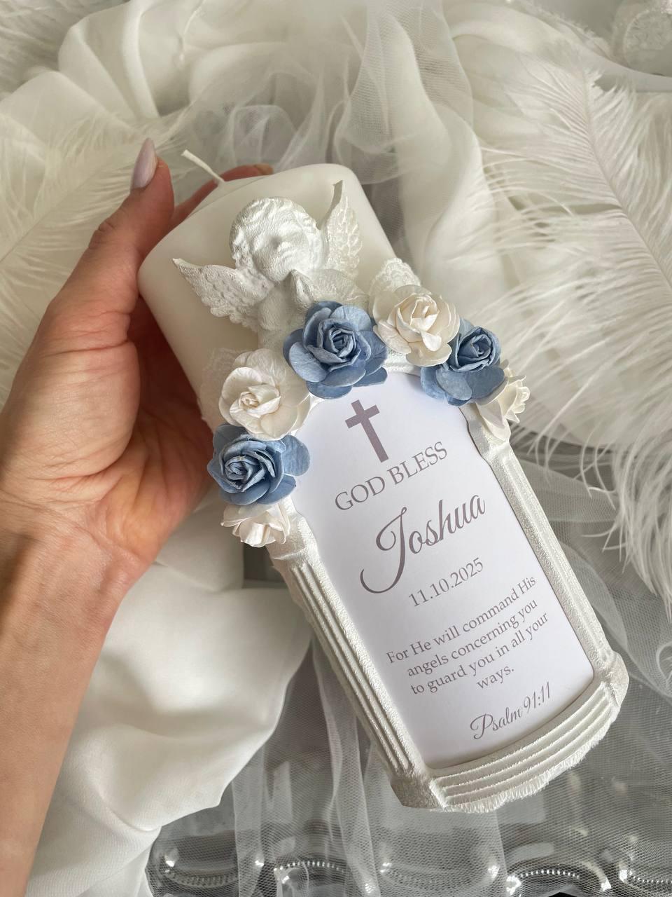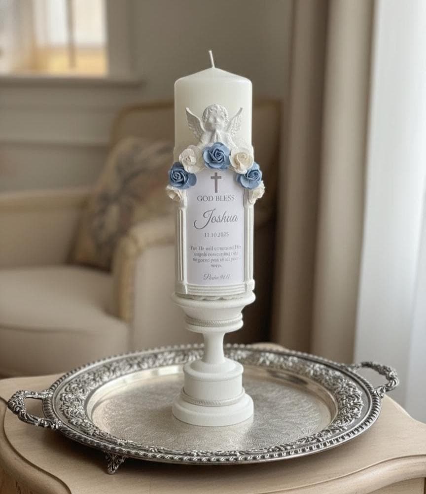 Celebrate your little one's sacred journey with our exquisite Personalized Blue Baptism Candle for Boy. This stunning, handcrafted christening keepsake is beautifully adorned with delicate blue floral accents, elegant lace, and a pristine white frame featuring a serene guardian angel at the top. Designed to honor momentous spiritual milestones, it serves as an ideal First Communion gift or a cherished addition to any dedication ceremony. With customizable details, including the child's name and baptism date, this custom name baptism candle becomes a truly unique and lasting symbol of faith, love, and divine blessings for your baby boy.