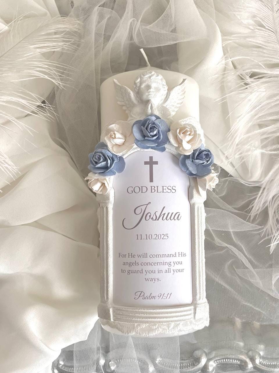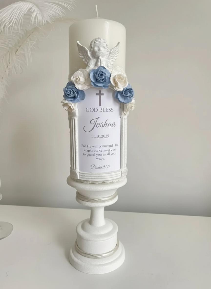 Design: Elegant white pillar candle embellished with charming blue floral appliqués, a delicate lace wrap around the base, a central white decorative frame for personalization, and a beautiful guardian angel figure.