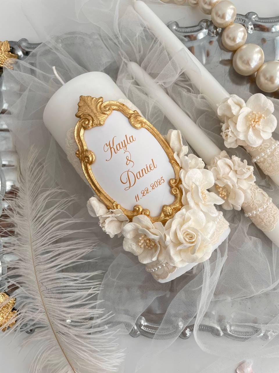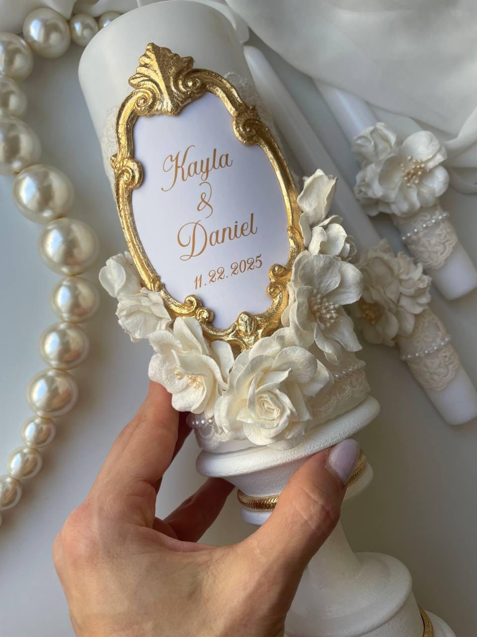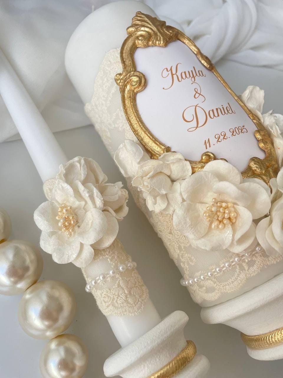Candles: The large сandle is adorned with delicate ivory lace, pearls, flowers, a beautiful gilded gold leaf frame, and personalized with your names and wedding date.
