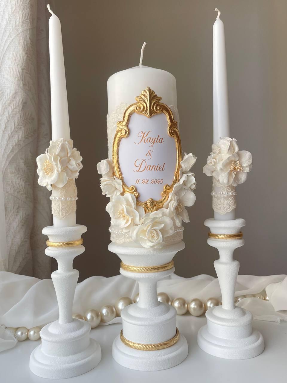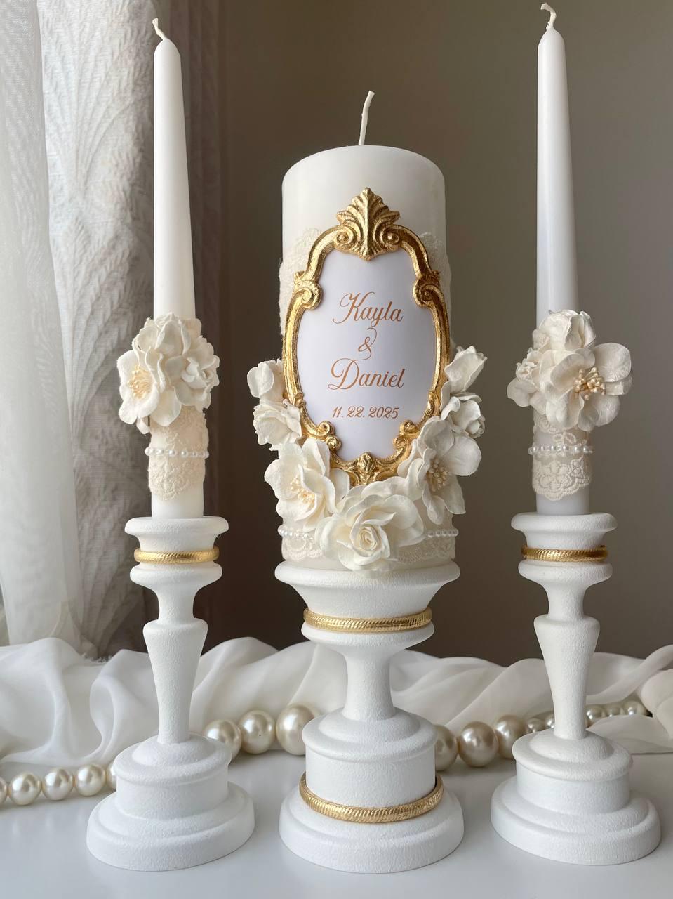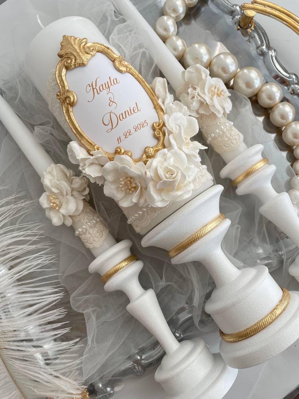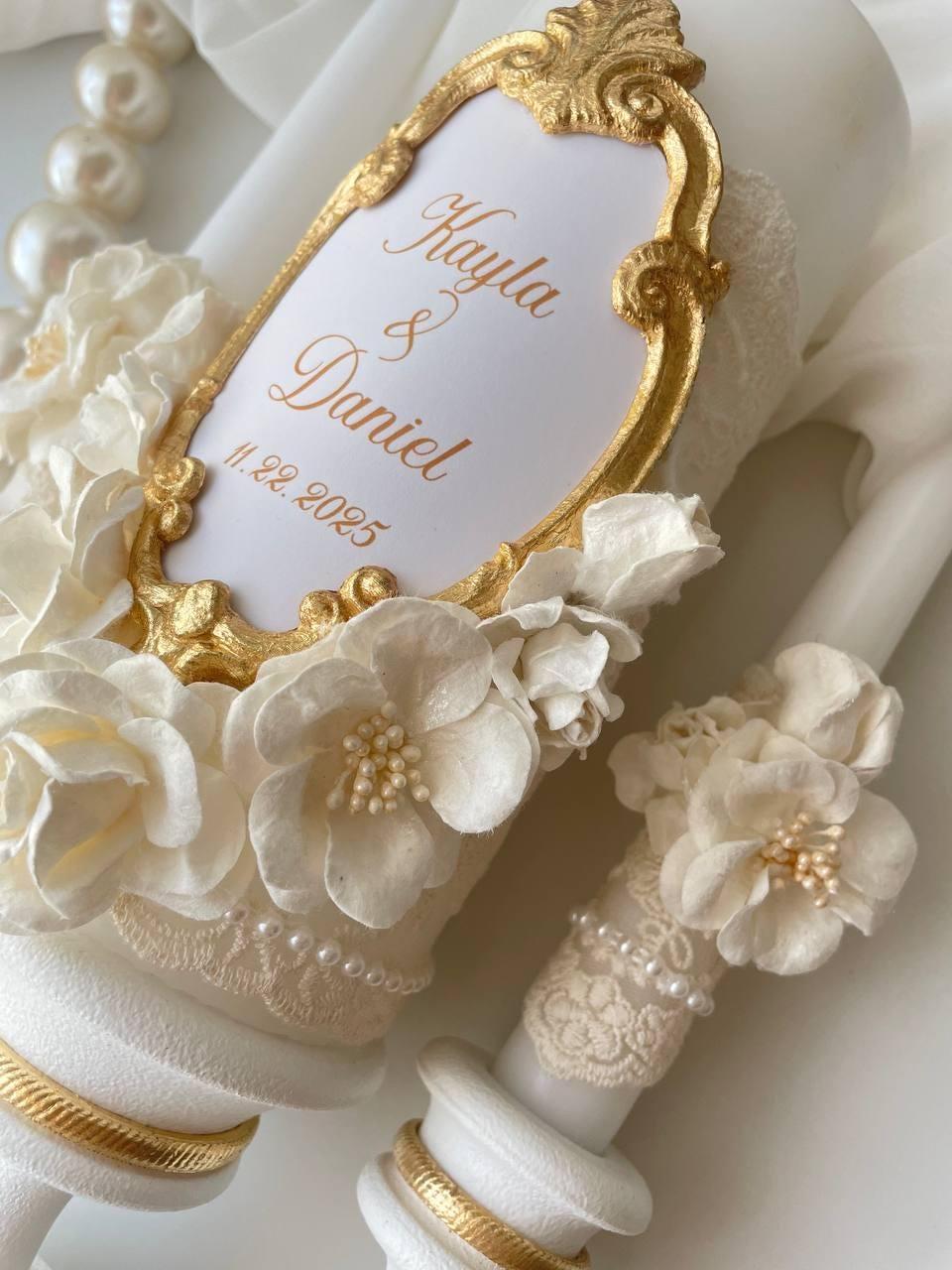 Candles: The large сandle is adorned with delicate ivory lace, pearls, flowers, a beautiful gilded gold leaf frame, and personalized with your names and wedding date.