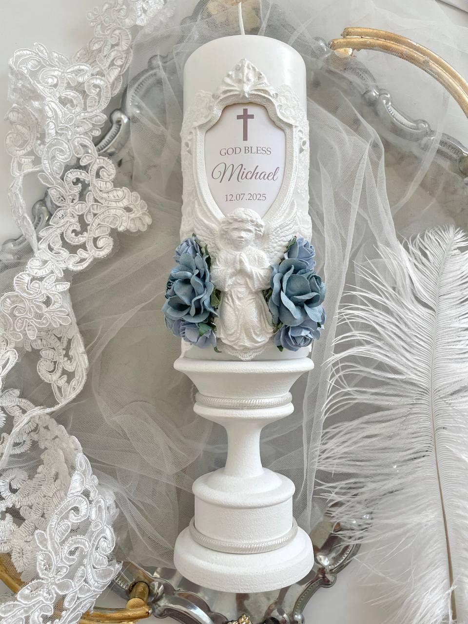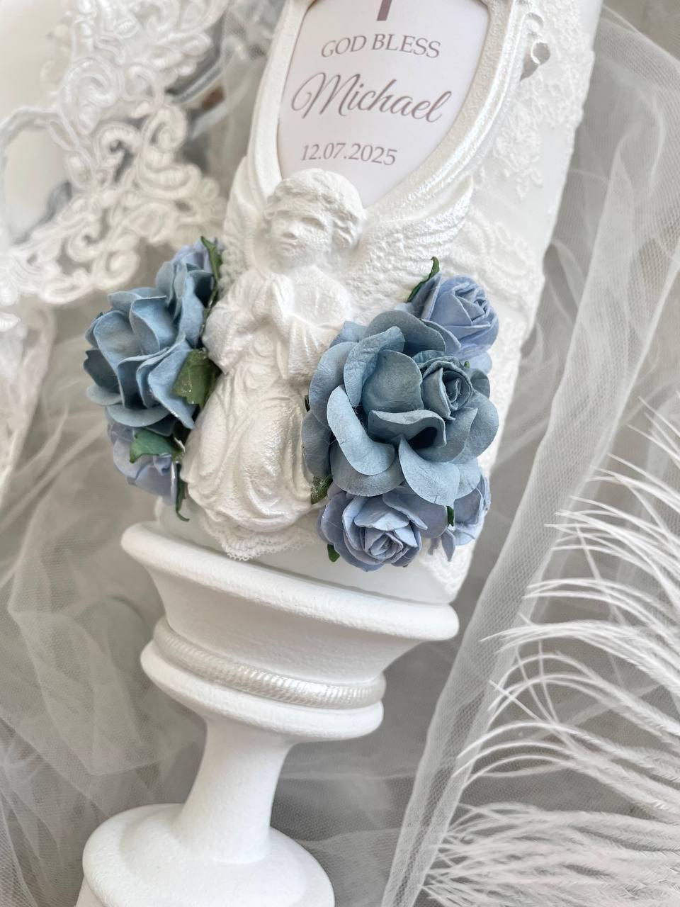 Blue Baptism Candle for Boy – White Lace Angel Candle with Florals – Personalized Keepsake Custom