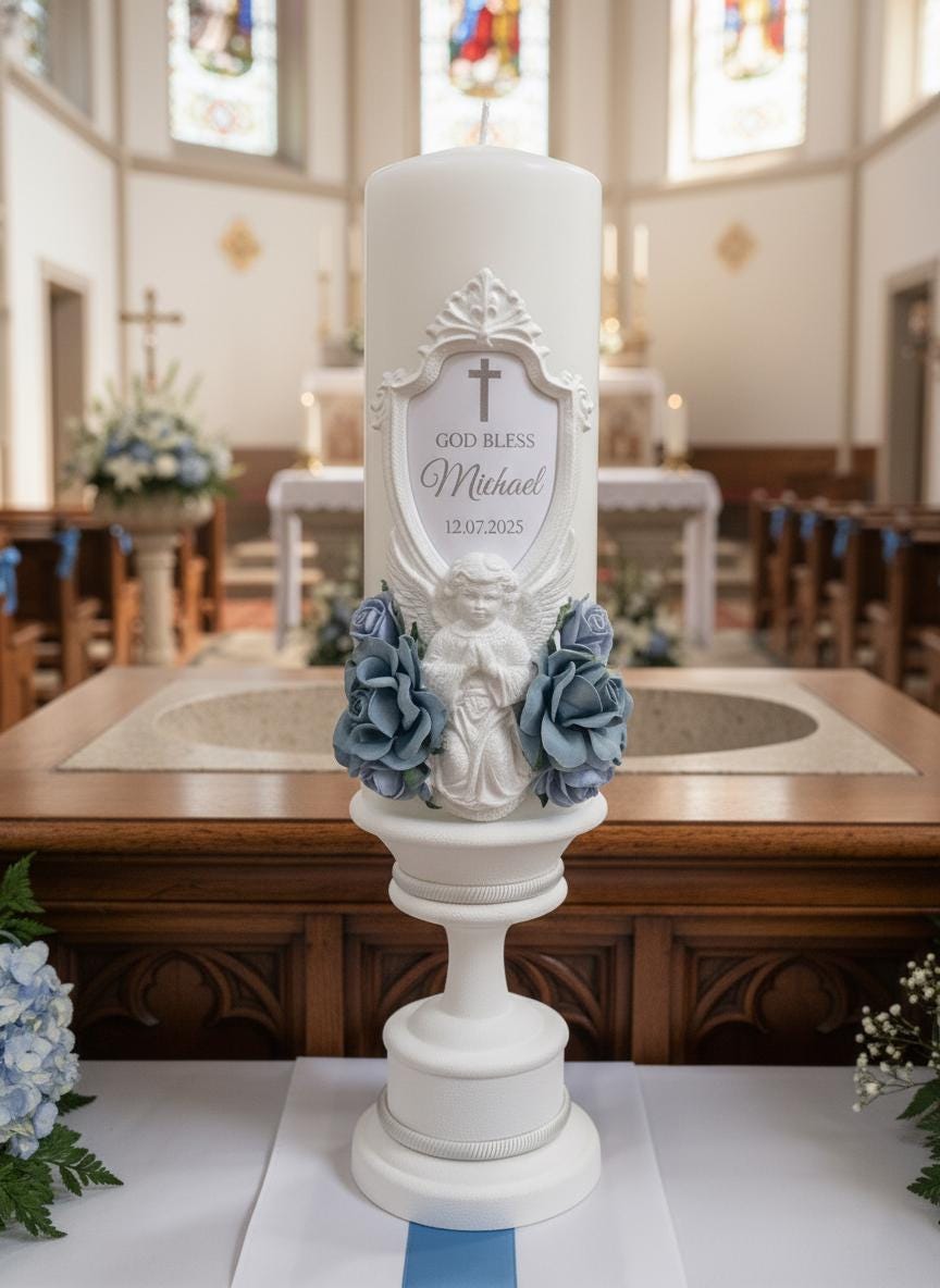 This candle is crafted to look elegant in ceremony photos and to remain a precious keepsake for years. Add his name, event date, or a short blessing to create a one-of-a-kind heirloom.