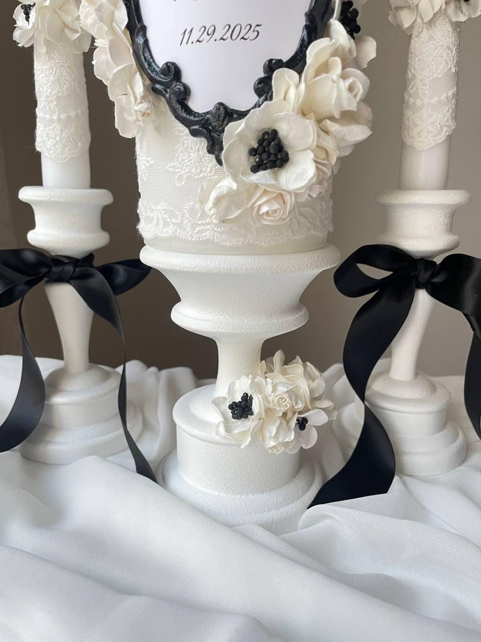 Create a striking centerpiece for your ceremony with this black & white unity candle set — handmade with white wax, white lace, and a bold black frame. Perfect for modern minimalist weddings or classic black-tie celebrations. ✨ Elegant. Timeless.