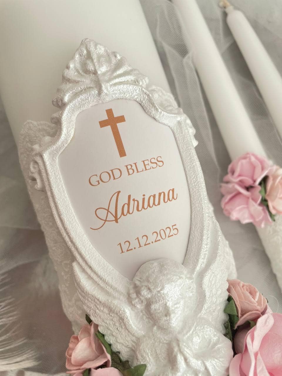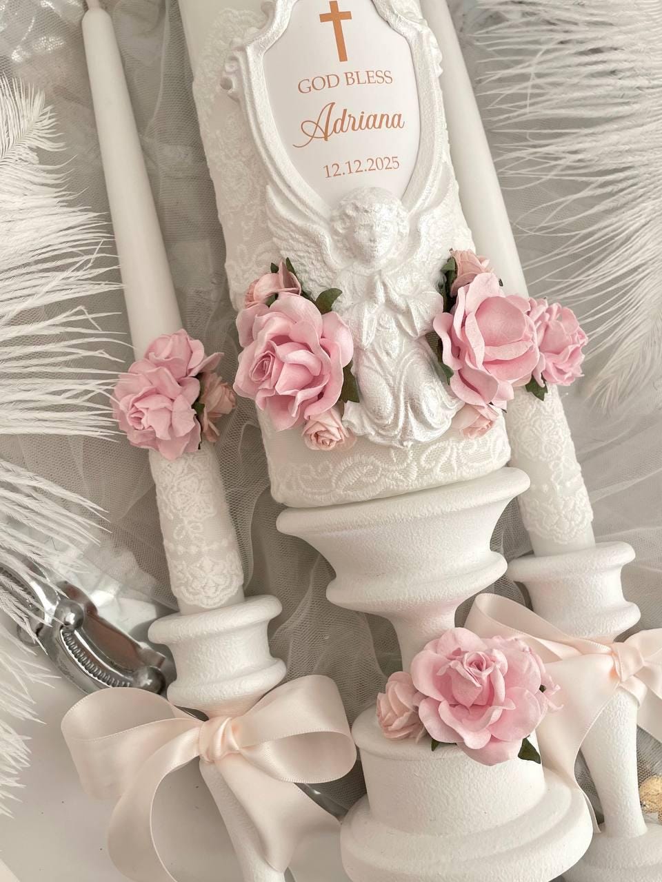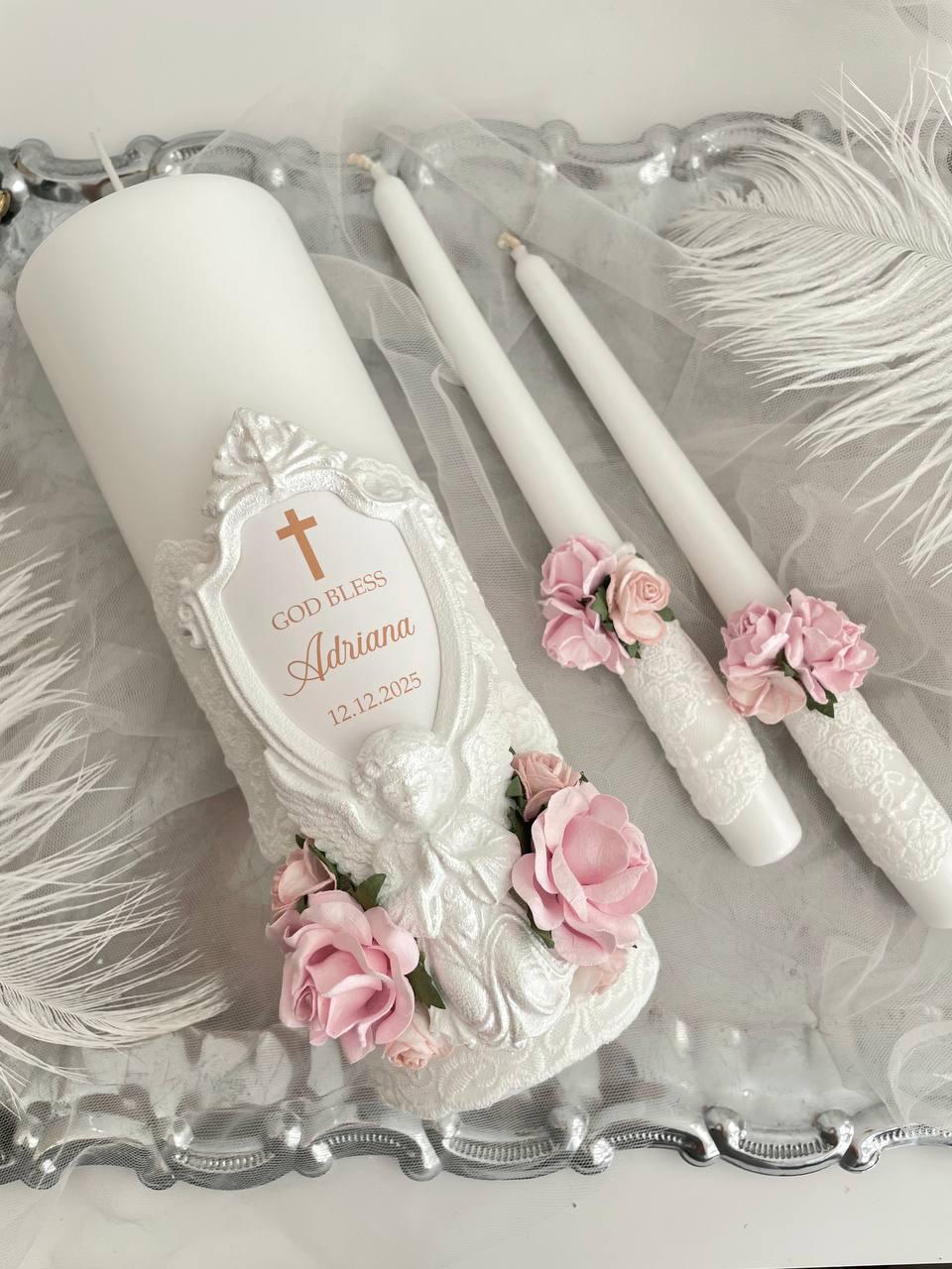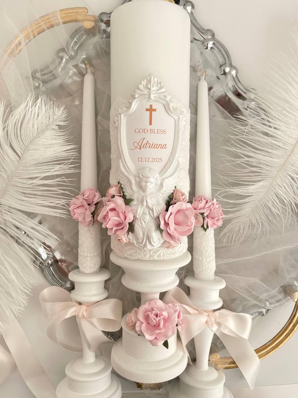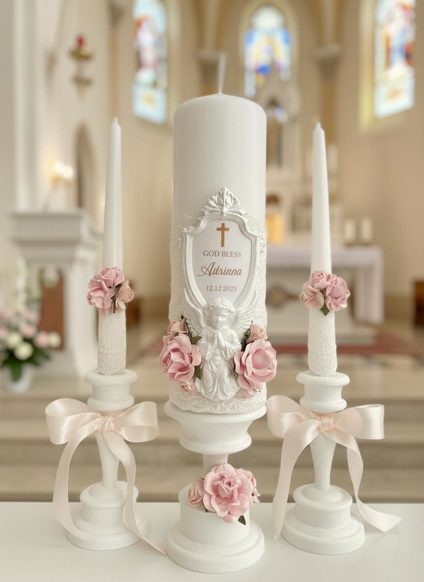 This Personalized Baptism Candle Set for Girl is a beautiful keepsake for her Christening, Baptism, First Communion, or Naming Ceremony. Designed with soft pink florals, delicate lace, bows, and a symbolic white angel, this candle brings purity, grace, and meaning to your baby girl’s special day. Each candle is handcrafted and personalized with the child’s name, event date, and an optional blessing, making it a precious keepsake for families and godparents. You can order one main candle or a full set with two godparent taper candles and matching holders.