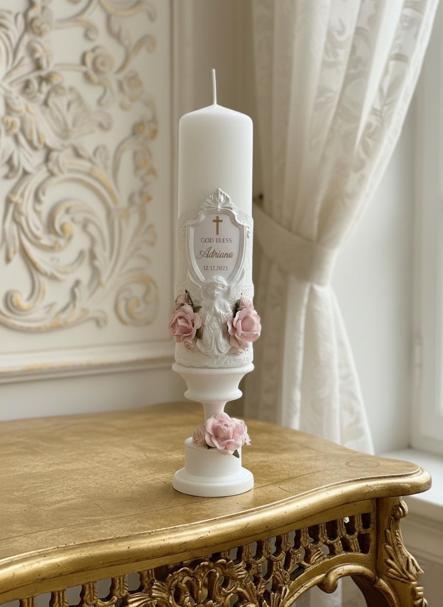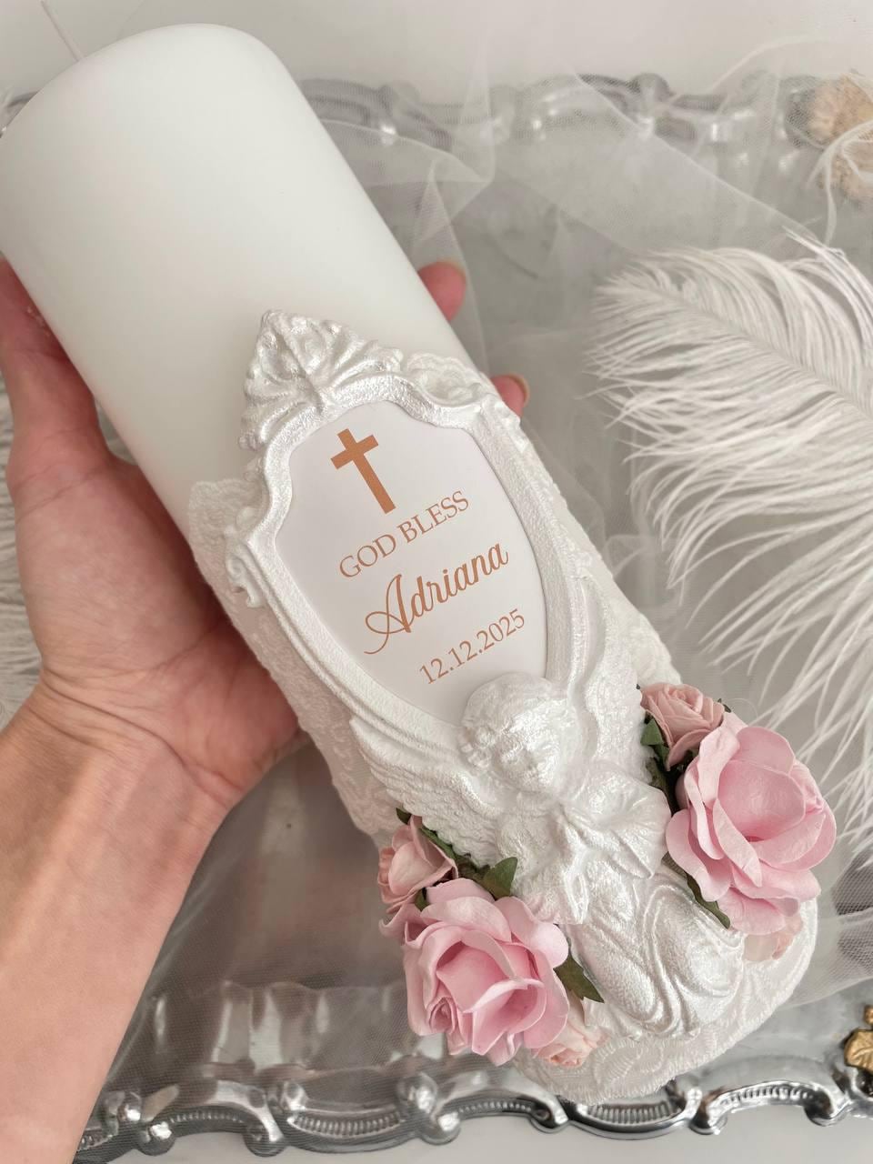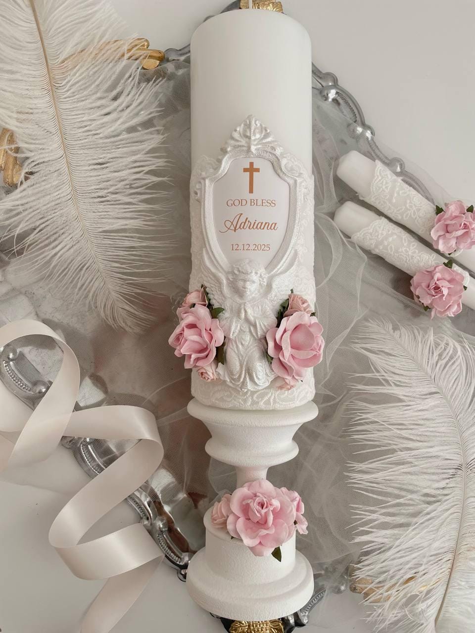 Personalized Baptism Candle for Girl – Pink Floral Christening Candle with Lace, Tapers & Angel Keepsake