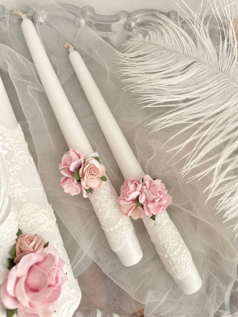 White candle with lace and handcrafted pink flowers or leave a note of flower color preferences