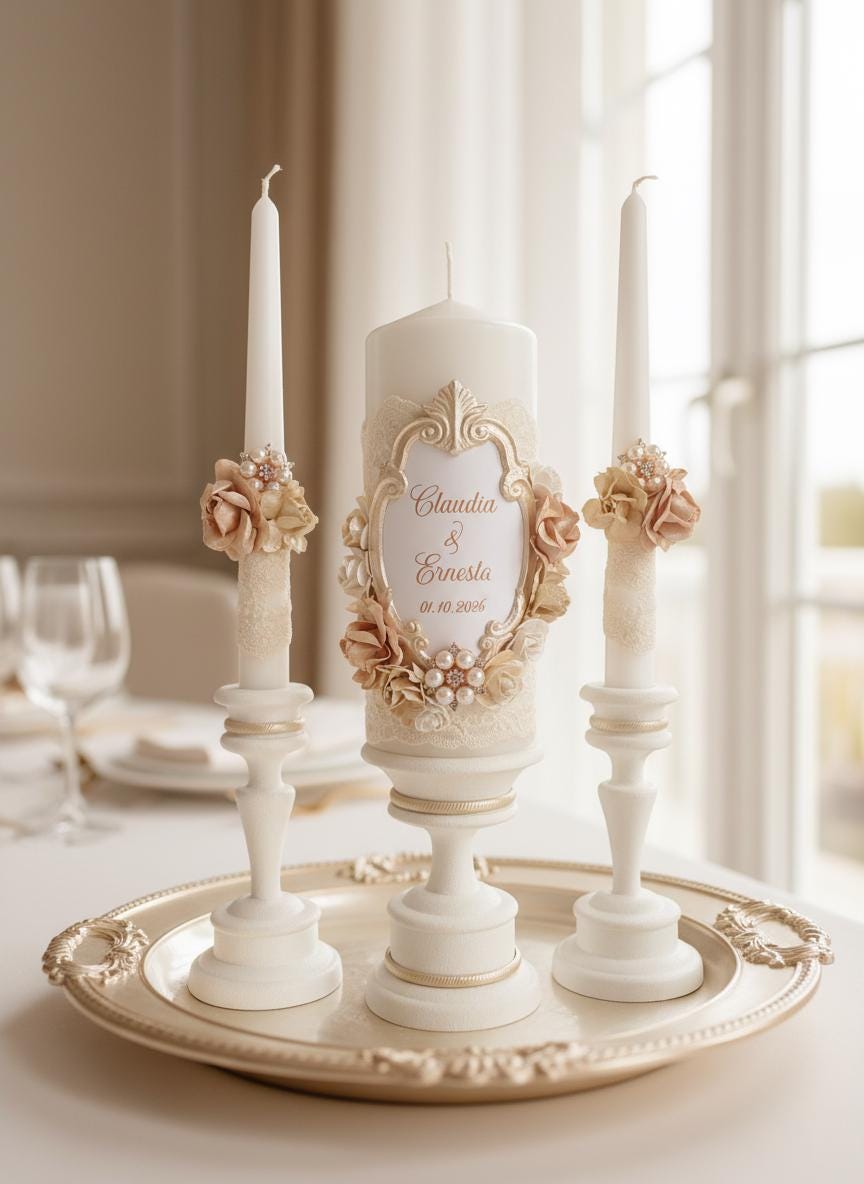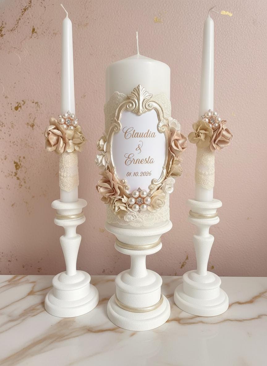 Champagne & Ivory Unity Candle Set – Elegant Neutral Wedding Candles – Lace, Flowers – Personalized Church Ceremony