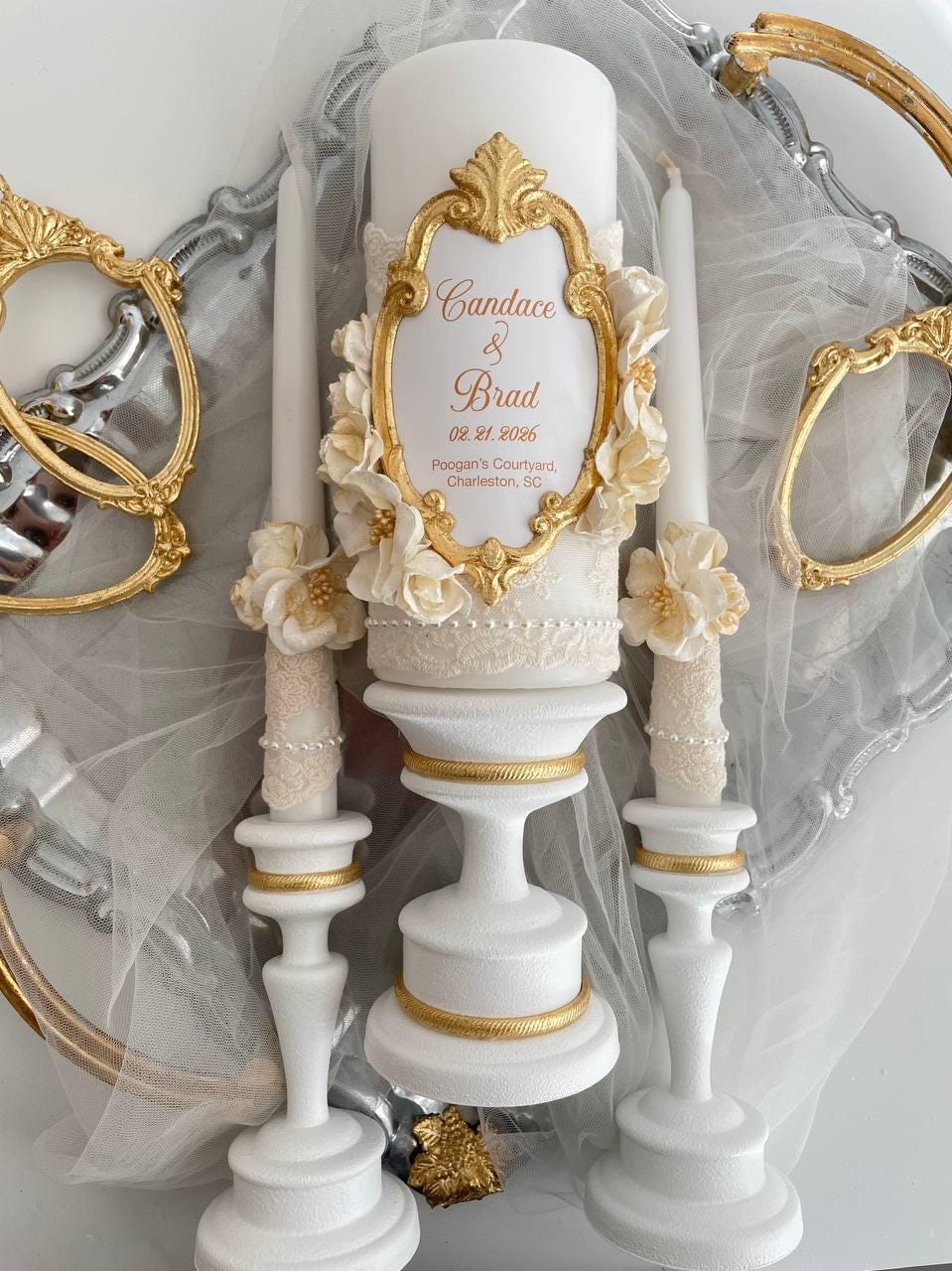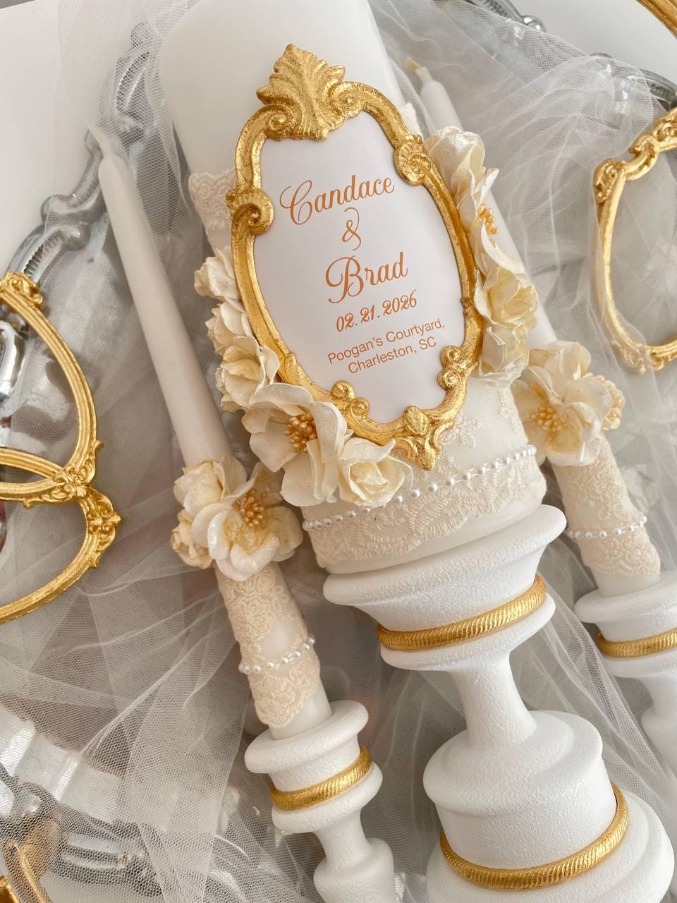 Create a timeless and elegant ceremony with our Ivory Cream & Gold Unity Candle Set — handcrafted with delicate ivory-cream lace, soft floral accents, and a luxurious gold frame designed for your personal message.