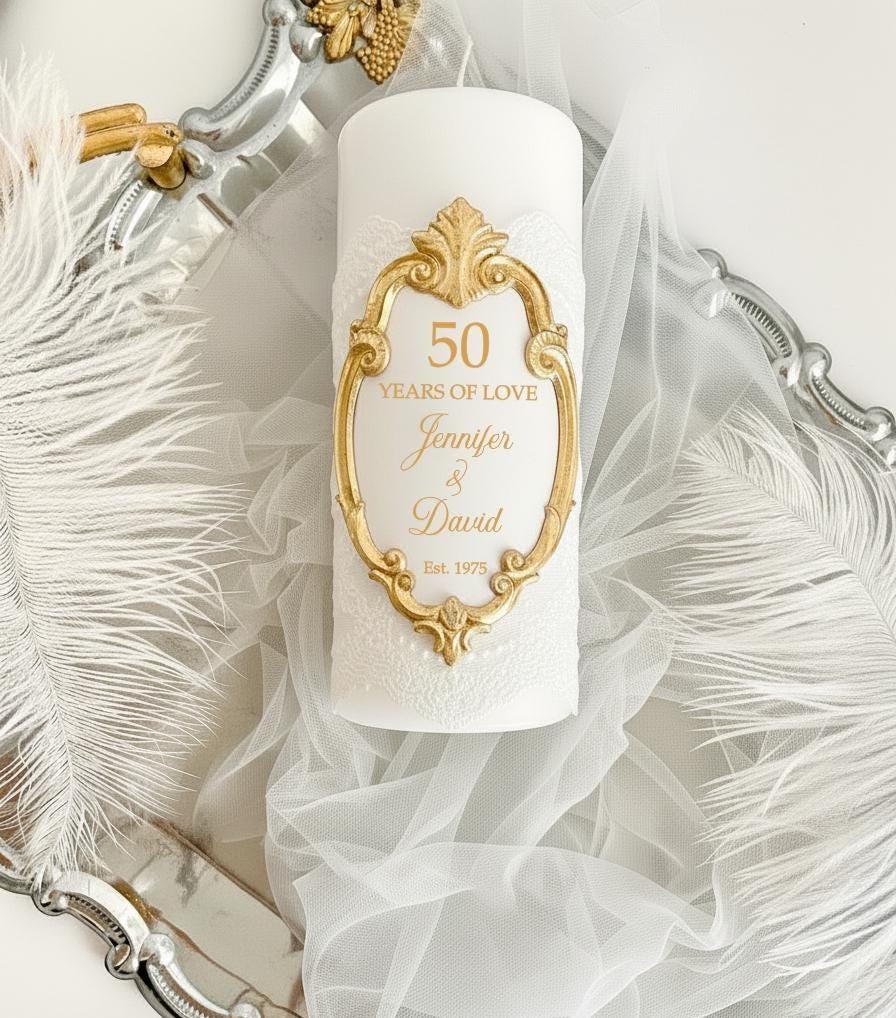 50th wedding anniversary candle with personalized golden frame. Custom anniversary candle with names and date, an unusual 50th anniversary gift.