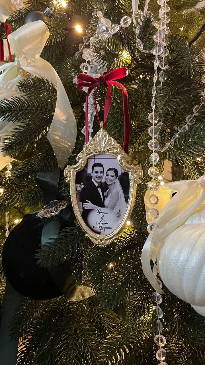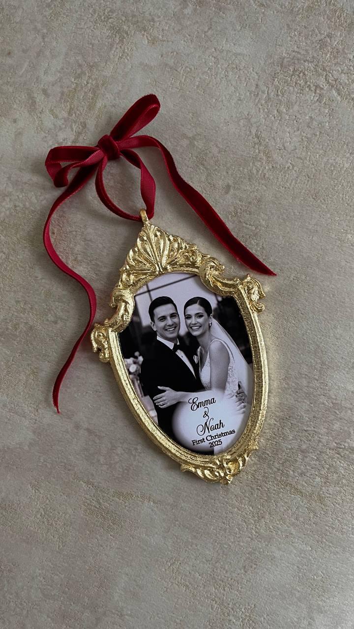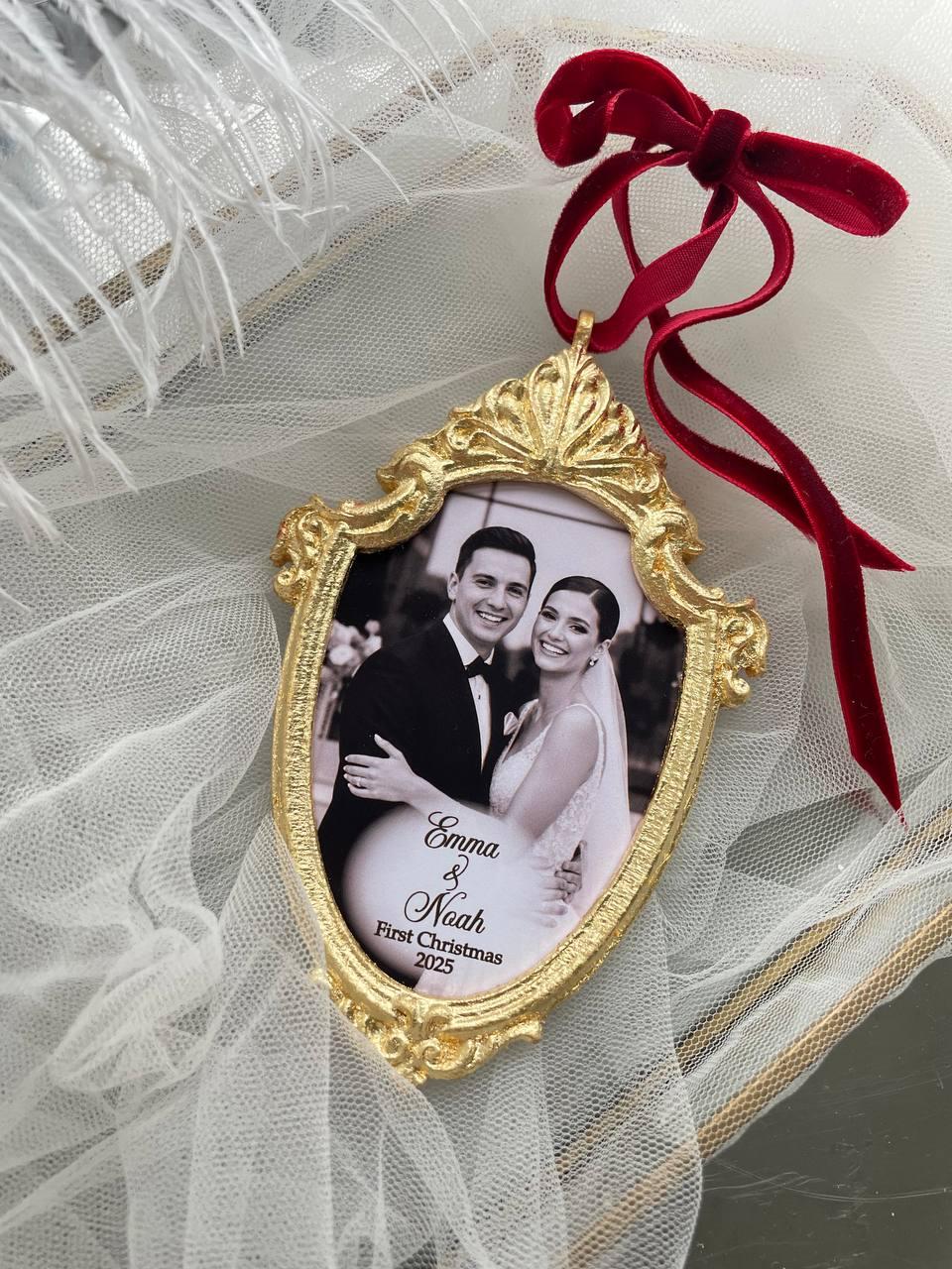 This custom wedding photo ornament features a hand-gilded vintage-style gold frame, your personalized couple photo, and a luxury velvet ribbon bow. Designed for couples who value timeless elegance and heirloom-quality décor.