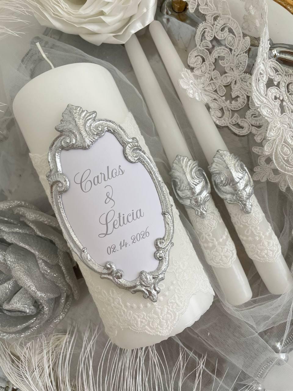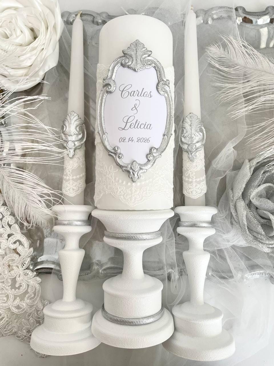 Elegant silver unity candle set with white lace and a vintage-style silver-leaf frame, personalized for classic or church wedding ceremonies.