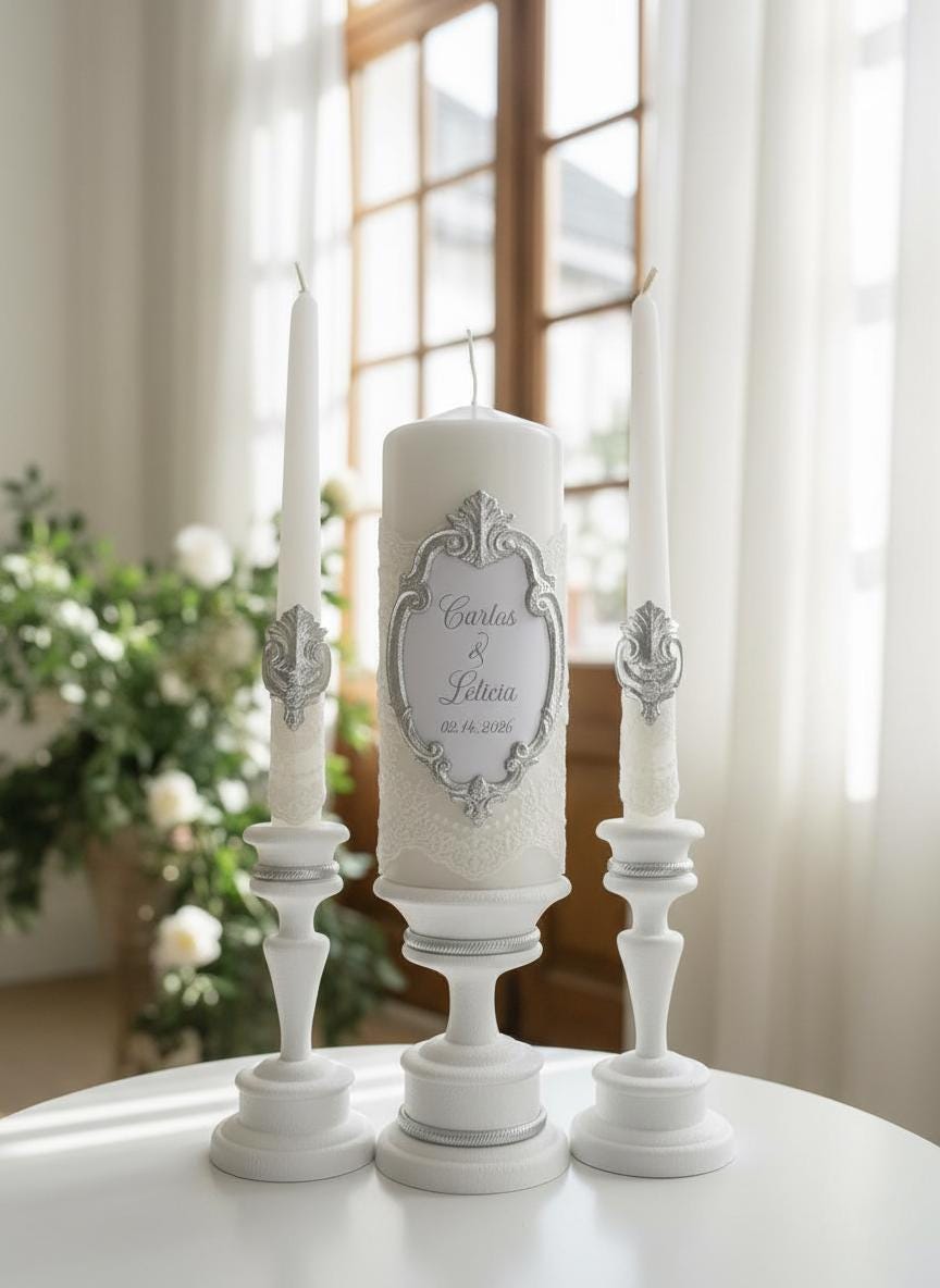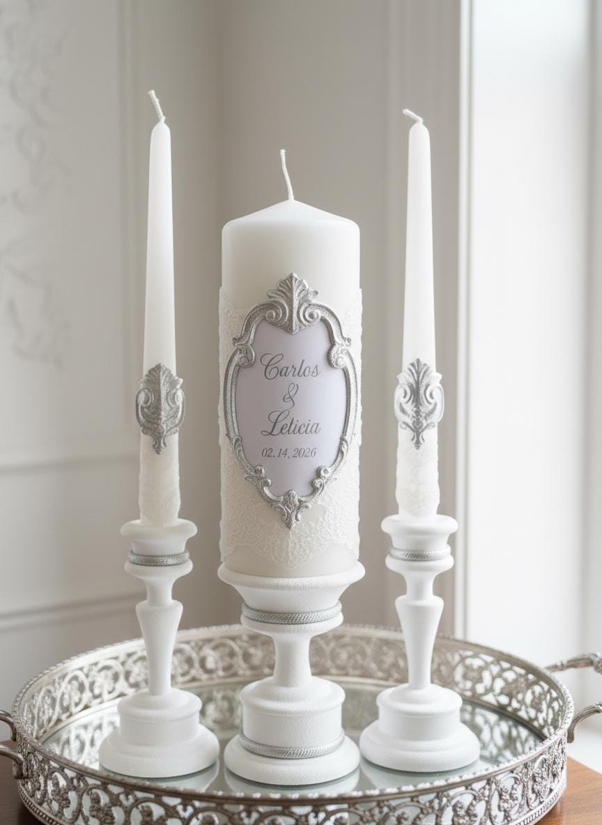 This Silver & White Unity Candle Set is created for elegant wedding ceremonies rooted in tradition, symbolism, and timeless beauty.